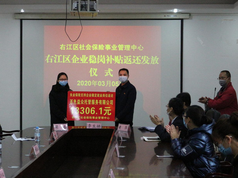 ??? 3月5日,在右江區(qū)社會(huì)保險(xiǎn)事業(yè)管理中心召開穩(wěn)崗補(bǔ)貼返還工作會(huì)議暨企業(yè)穩(wěn)崗補(bǔ)貼返還發(fā)放儀式,我公司作為首批返還企業(yè)代表之一應(yīng)邀參加,會(huì)上社保中心主任李生梯對(duì)我公司響應(yīng)穩(wěn)崗補(bǔ)貼政策給予高度肯定,期望通過穩(wěn)崗補(bǔ)貼返還為公司的穩(wěn)定復(fù)產(chǎn)助力。截止目前,我公司有8家子公司符合享受失業(yè)保險(xiǎn)穩(wěn)崗返還補(bǔ)貼條件,獲得穩(wěn)崗返還補(bǔ)貼3.6萬元,惠及企業(yè)員工約150人。(通訊員:黃 芬)