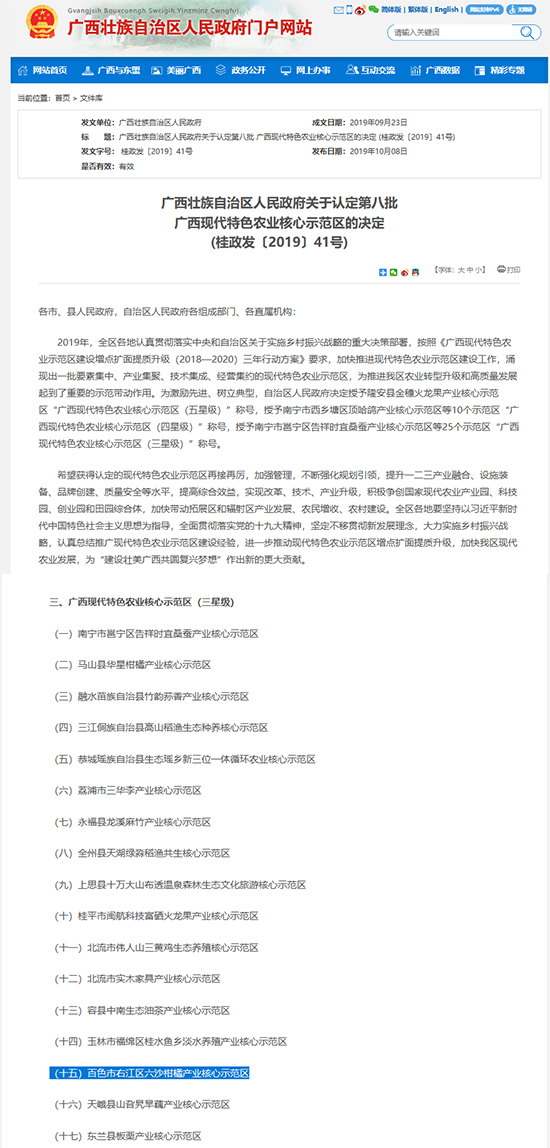 日前,自治區(qū)人民政府決定授予全區(qū)25個現代特色農業(yè)核心示范區(qū)“廣西現代特色農業(yè)核心示范區(qū)(三星級)”稱號,百色市右江區(qū)六沙柑橘產業(yè)核心示范區(qū)榜上有名。