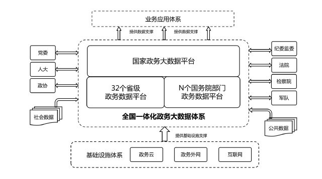 全國一體化政務(wù)大數(shù)據(jù)體系包括三類平臺(tái)和三大支撐。三類平臺(tái)為“1+32+N”框架結(jié)構(gòu)?!?”是指國家政務(wù)大數(shù)據(jù)平臺(tái),是我國政務(wù)數(shù)據(jù)管理的總樞紐、政務(wù)數(shù)據(jù)流轉(zhuǎn)的總通道、政務(wù)數(shù)據(jù)服務(wù)的總門戶;“32”是指31個(gè)?。ㄗ灾螀^(qū)、直轄市)和新疆生產(chǎn)建設(shè)兵團(tuán)統(tǒng)籌建設(shè)的省級(jí)政務(wù)數(shù)據(jù)平臺(tái),負(fù)責(zé)本地區(qū)政務(wù)數(shù)據(jù)的目錄編制、供需對(duì)接、匯聚整合、共享開放,與國家平臺(tái)實(shí)現(xiàn)級(jí)聯(lián)對(duì)接;“N”是指國務(wù)院有關(guān)部門的政務(wù)數(shù)據(jù)平臺(tái),負(fù)責(zé)本部門本行業(yè)數(shù)據(jù)匯聚整合與供需對(duì)接,與國家平臺(tái)實(shí)現(xiàn)互聯(lián)互通,尚未建設(shè)政務(wù)數(shù)據(jù)平臺(tái)的部門,可由國家平臺(tái)提供服務(wù)支撐。三大支撐包括管理機(jī)制、標(biāo)準(zhǔn)規(guī)范、安全保障三個(gè)方面。