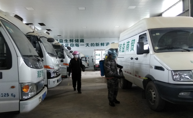 潤(rùn)益商貿(mào)公司工作人員正在消毒配送車(chē)輛?