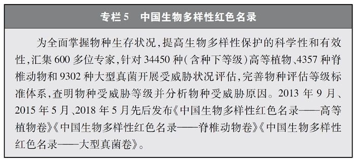 開展全國生物多樣性調(diào)查與評估。大力推進生物多樣性保護重大工程實施,結合自然資源調(diào)查、生態(tài)系統(tǒng)監(jiān)測評估等工作,不斷完善生物多樣性調(diào)查與評估能力,首次將生物多樣性指標納入生態(tài)質量綜合評價指標體系,引導地方加強生態(tài)文明建設與生物多樣性保護。開展自然資源調(diào)查,包括森林、草原、水、濕地、荒漠、海洋等,建立自然資源調(diào)查評價監(jiān)測制度。構建了涵蓋2376個縣級行政單元、樣線總長超過3.4萬公里的物種分布數(shù)據(jù)庫,建立物種資源調(diào)查及收集信息平臺,準確反映野生動植物空間分布狀況。完成長江經(jīng)濟帶、京津冀等國家戰(zhàn)略區(qū)域180多個縣級行政區(qū)生物多樣性調(diào)查與評估。組織開展近海漁業(yè)資源調(diào)查,初步掌握近海漁業(yè)資源狀況。陸續(xù)發(fā)布《中國植物紅皮書》《中國瀕危動物紅皮書》《中國物種紅色名錄》《中國生物多樣性紅色名錄》,基本掌握生物多樣性總體情況,為加強生物多樣性保護奠定了科學基礎。
