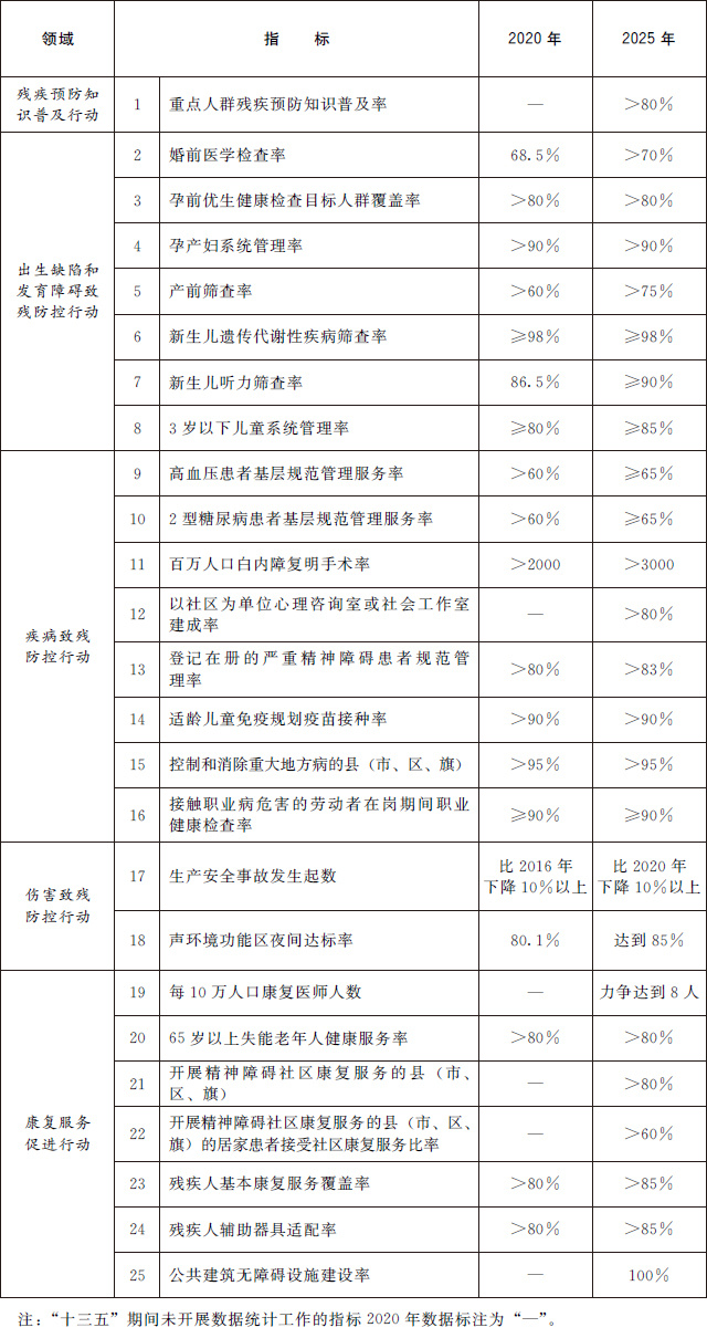 到2025年,覆蓋經(jīng)濟社會發(fā)展各領域的殘疾預防政策體系進一步完善,全人群全生命周期殘疾預防服務網(wǎng)絡更加健全,全民殘疾預防素養(yǎng)明顯提升,遺傳和發(fā)育、疾病、傷害等主要致殘因素得到有效防控,殘疾康復服務狀況持續(xù)改善,殘疾預防主要指標處于中高收入國家前列。