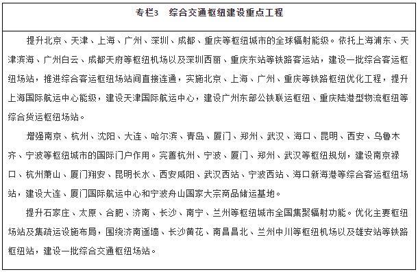 優(yōu)化綜合交通樞紐城市功能。提升國際性綜合交通樞紐的全球聯(lián)通水平和資源要素配置能力,增強(qiáng)部分樞紐國際門戶功能。優(yōu)化全國性綜合交通樞紐客貨中轉(zhuǎn)設(shè)施、集疏運(yùn)網(wǎng)絡(luò)及客運(yùn)場站間快速連接系統(tǒng)。增強(qiáng)區(qū)域性綜合交通樞紐的銜接轉(zhuǎn)運(yùn)能力,發(fā)展口岸樞紐。強(qiáng)化不同層級綜合交通樞紐城市之間功能互補(bǔ)、設(shè)施連通、運(yùn)行協(xié)同。