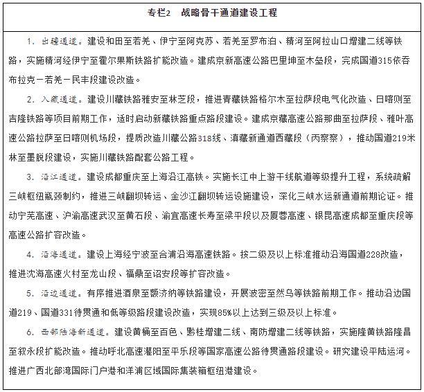 加強(qiáng)戰(zhàn)略骨干通道建設(shè)。推進(jìn)出疆入藏通道建設(shè),擴(kuò)大甘新、青新、青藏、川藏四條內(nèi)聯(lián)主通道通行能力,穩(wěn)步推進(jìn)川藏鐵路建設(shè),加快推進(jìn)新藏鐵路和田至日喀則段前期工作、適時(shí)啟動(dòng)重點(diǎn)路段建設(shè),有序推進(jìn)滇藏鐵路前期工作,密實(shí)優(yōu)化航空航線網(wǎng)絡(luò)布局,構(gòu)建多向聯(lián)通的通道布局。暢通沿江通道,加快建設(shè)沿江高鐵,優(yōu)化以高等級航道和干線鐵路、高速公路為骨干的沿江綜合運(yùn)輸大通道功能。升級沿海通道,提高鐵路通道能力,推進(jìn)高速公路繁忙路段擴(kuò)容改造,提升港口航道整體效能,構(gòu)建大容量、高品質(zhì)的運(yùn)輸走廊。貫通沿邊通道,提級改造普通國省干線,推進(jìn)重點(diǎn)方向沿邊鐵路建設(shè),提高安全保障水平。建設(shè)西部陸海新通道,發(fā)揮鐵路在陸路運(yùn)輸中的骨干作用和港口在海上運(yùn)輸中的門戶作用,強(qiáng)化東、中、西三條通路,形成大能力主通道,銜接國際運(yùn)輸通道。