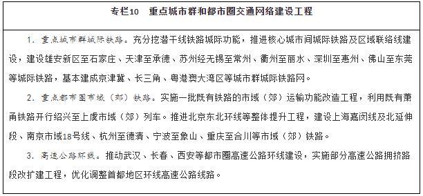 強(qiáng)化重點(diǎn)城市群城際交通建設(shè)。圍繞京津冀、長三角、粵港澳大灣區(qū)、成渝、長江中游等城市群,以軌道交通、高速公路為骨干,提升城際運(yùn)輸通道功能,加強(qiáng)核心城市快速直連,構(gòu)建多節(jié)點(diǎn)、網(wǎng)絡(luò)化的城際交通網(wǎng),實(shí)現(xiàn)城市群內(nèi)主要城市間2小時(shí)通達(dá)。整體推進(jìn)京津冀、長三角、粵港澳大灣區(qū)城際鐵路和市域(郊)鐵路建設(shè),有序推動(dòng)成渝地區(qū)雙城經(jīng)濟(jì)圈城際鐵路和市域(郊)鐵路建設(shè),加強(qiáng)與高速鐵路、普速鐵路一體銜接,擴(kuò)大對5萬人口以上城鎮(zhèn)的有效覆蓋。