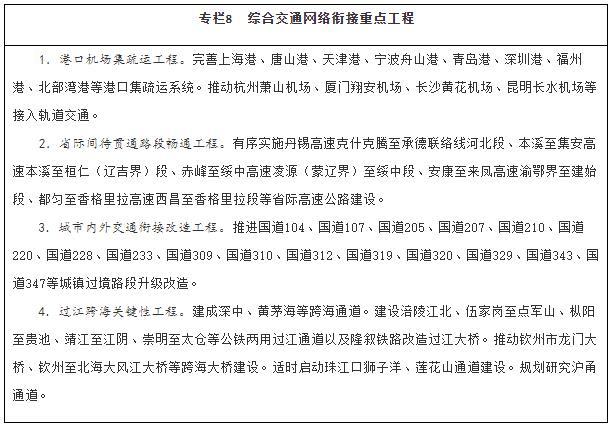 加快解決制約人民美好出行、貨物高效流通的瓶頸,強(qiáng)化綜合交通網(wǎng)絡(luò)有機(jī)銜接。打通公路省際待貫通路段,加強(qiáng)干線公路與城市道路有效銜接,推進(jìn)城鎮(zhèn)密集地區(qū)干線公路過境段、進(jìn)出城瓶頸路段升級改造。加強(qiáng)樞紐機(jī)場與軌道交通高效銜接,使換乘更加便捷。強(qiáng)化進(jìn)港區(qū)、進(jìn)園區(qū)、進(jìn)廠區(qū)、進(jìn)規(guī)?;r(nóng)產(chǎn)品基地等集疏運(yùn)設(shè)施建設(shè),加快推動(dòng)鐵路進(jìn)港口重點(diǎn)港區(qū)和大型工礦企業(yè)、物流園區(qū)、重點(diǎn)物資儲(chǔ)備庫。統(tǒng)籌考慮資源高效利用、生態(tài)環(huán)境保護(hù)和防洪航運(yùn)安全,有序建設(shè)各種運(yùn)輸方式共享通道資源的過江跨海通道。推動(dòng)超大特大城市的大型綜合客運(yùn)樞紐間通過軌道交通互連。加快實(shí)現(xiàn)聯(lián)系緊密的綜合貨運(yùn)樞紐間通過聯(lián)絡(luò)線或?qū)S猛ǖ阑ミB。