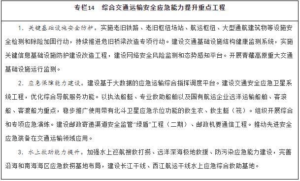 健全綜合交通運(yùn)輸應(yīng)急管理體制機(jī)制,完善應(yīng)急協(xié)調(diào)機(jī)制和應(yīng)急預(yù)案體系,加強(qiáng)交通運(yùn)輸調(diào)度與應(yīng)急指揮平臺建設(shè)。推進(jìn)區(qū)域性公路應(yīng)急裝備物資儲(chǔ)備中心建設(shè)。加強(qiáng)水上交通安全監(jiān)管、航海保障和救助打撈能力建設(shè),完善沿海和內(nèi)河溢油應(yīng)急設(shè)備庫,構(gòu)建陸海空天一體化水上交通運(yùn)輸安全保障體系。建設(shè)城市軌道交通應(yīng)急演練中心。以骨干航空物流企業(yè)為主體構(gòu)建航空應(yīng)急服務(wù)網(wǎng)絡(luò)。建設(shè)海事監(jiān)管指揮系統(tǒng)。在開展城市交通基礎(chǔ)設(shè)施地下空間、低洼區(qū)域、重點(diǎn)區(qū)段、重要點(diǎn)位、關(guān)鍵設(shè)施等隱患排查基礎(chǔ)上,建立健全風(fēng)險(xiǎn)臺賬和災(zāi)害隱患清單,補(bǔ)齊設(shè)施設(shè)備、應(yīng)急搶險(xiǎn)物資等短板,持續(xù)完善應(yīng)急處置預(yù)案,健全應(yīng)急響應(yīng)機(jī)制,提升應(yīng)對極端天氣能力。加強(qiáng)應(yīng)急專業(yè)隊(duì)伍和志愿者隊(duì)伍建設(shè),充實(shí)國家應(yīng)急運(yùn)輸儲(chǔ)備力量。健全應(yīng)對重大疫情、防范應(yīng)對恐怖襲擊、保障信息安全等非傳統(tǒng)安全應(yīng)急指揮體系和應(yīng)急交通組織。