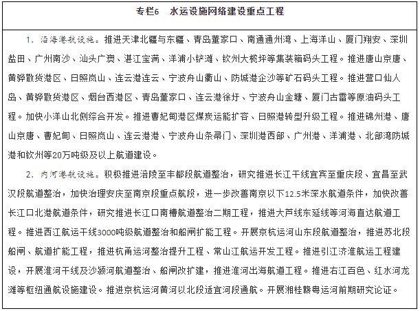優(yōu)化暢通水運(yùn)設(shè)施網(wǎng)絡(luò)。建設(shè)京津冀、長三角、粵港澳大灣區(qū)世界級港口群,支持山東打造世界一流的海洋港口,推進(jìn)東北地區(qū)沿海港口一體化發(fā)展,優(yōu)化港口功能布局,推動(dòng)資源整合和共享共用。有序推進(jìn)沿海港口專業(yè)化碼頭及進(jìn)出港航道等公共設(shè)施建設(shè)。適度超前建設(shè)糧食、能源、礦產(chǎn)資源的接卸、儲(chǔ)存、中轉(zhuǎn)設(shè)施,推進(jìn)沿海沿江液化天然氣碼頭規(guī)劃建設(shè)。提升內(nèi)河港口專業(yè)化、規(guī)模化水平,合理集中布局集裝箱、煤炭、鐵礦石、商品汽車等專業(yè)化碼頭。加強(qiáng)內(nèi)河高等級航道擴(kuò)能升級與暢通攻堅(jiān)建設(shè),完善長江、珠江、京杭運(yùn)河和淮河等水系內(nèi)河高等級航道網(wǎng)絡(luò),進(jìn)一步提升珠三角高等級航道網(wǎng)出海能力,全面加強(qiáng)長三角、珠江—西江高等級航道網(wǎng)未達(dá)標(biāo)段建設(shè)。推動(dòng)重要支流航道和庫湖區(qū)航道、內(nèi)河旅游航道、便民碼頭建設(shè)。