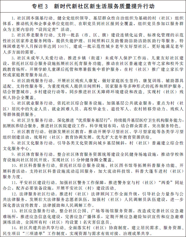 到2025年末,黨建引領(lǐng)社區(qū)服務(wù)體系建設(shè)更加完善,服務(wù)主體和服務(wù)業(yè)態(tài)更加豐富,線上線下服務(wù)機制更加融合,精準(zhǔn)化、精細(xì)化、智能化水平持續(xù)提升,社區(qū)吸納就業(yè)能力不斷增強,基本公共服務(wù)均等化水平明顯提升,人民群眾操心事、煩心事、揪心事更好解決,獲得感、幸福感、安全感不斷增強。