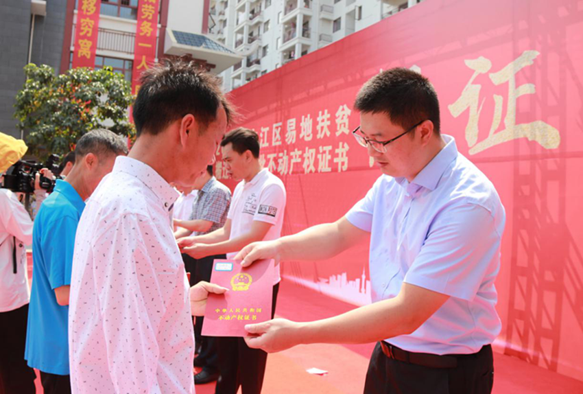 5月16日上午,右江區(qū)“老鄉(xiāng)家園—迎龍易地扶貧搬遷安置小鎮(zhèn)”搬遷戶不動產(chǎn)權證書頒證儀式在安置小鎮(zhèn)舉行,第一批26戶搬遷戶順利拿到了產(chǎn)權證書。百色市發(fā)改委副主任、市水庫和扶貧易地安置管理局局長羅加攀,右江區(qū)委常委、區(qū)人民政府副區(qū)長岑萬興,右江區(qū)委常委、宣傳部部長、區(qū)人民政府副區(qū)長王世凡,右江區(qū)委常委、辦公室主任盧靈及右江區(qū)直單位、鄉(xiāng)鎮(zhèn)代表,廣西百色益眾投資有限公司董事長、總經(jīng)理趙家臣出席儀式。儀式由王世凡主持。