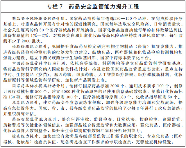 完善藥品安全監(jiān)管制度。加強(qiáng)藥物臨床試驗核查,嚴(yán)格執(zhí)行藥品、醫(yī)療器械、化妝品等生產(chǎn)質(zhì)量管理規(guī)范,對重點生產(chǎn)企業(yè)開展全覆蓋檢查。開展藥品質(zhì)量提升行動,健全生物制品等高風(fēng)險產(chǎn)品標(biāo)準(zhǔn)制定工作機(jī)制,提高藥品、醫(yī)療器械、化妝品標(biāo)準(zhǔn)。改革和完善疫苗監(jiān)管體制機(jī)制,提高省級藥品檢驗檢測機(jī)構(gòu)對轄區(qū)內(nèi)生產(chǎn)的主要疫苗品種批簽發(fā)能力。深入開展無菌植入性醫(yī)療器械監(jiān)督檢查、化妝品“線上凈網(wǎng)、線下清源”等專項整治行動,切實規(guī)范藥品、醫(yī)療器械、化妝品市場秩序。