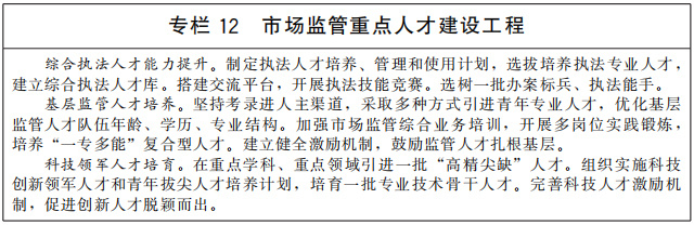 加強(qiáng)人才隊伍建設(shè)。健全人才引進(jìn)、培養(yǎng)、使用、評價、激勵機(jī)制,統(tǒng)籌推進(jìn)市場監(jiān)管人才隊伍建設(shè)。加快高水平市場監(jiān)管智庫和綜合型研究機(jī)構(gòu)建設(shè),加強(qiáng)重大理論和實踐問題戰(zhàn)略研究、決策咨詢,開展人才需求分析。推進(jìn)市場監(jiān)管人才培養(yǎng),加快相關(guān)學(xué)科專業(yè)建設(shè),培養(yǎng)符合市場監(jiān)管現(xiàn)代化需求的后備人才。在檢驗檢測、藥品審評、檢查核查、網(wǎng)絡(luò)數(shù)據(jù)監(jiān)管、知識產(chǎn)權(quán)、質(zhì)量技術(shù)等重點專業(yè)領(lǐng)域,著力培養(yǎng)引進(jìn)一批“高精尖缺”人才。組織開展綜合執(zhí)法大練兵,提升基層人才隊伍能力水平。加強(qiáng)市場監(jiān)管文化建設(shè),增進(jìn)價值認(rèn)同、情感認(rèn)同、文化認(rèn)同,增強(qiáng)做好市場監(jiān)管工作的責(zé)任感和使命感。