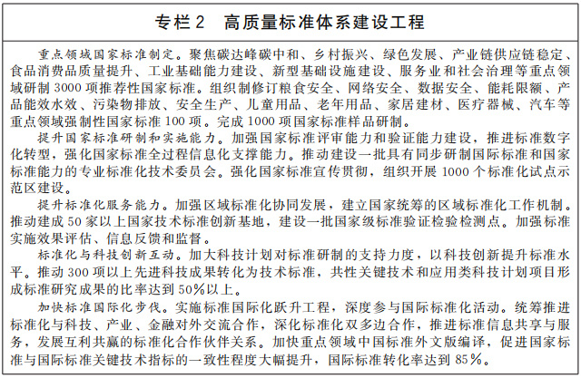 深化標(biāo)準(zhǔn)化改革創(chuàng)新。加快標(biāo)準(zhǔn)供給由政府主導(dǎo)向政府與市場并重轉(zhuǎn)變,標(biāo)準(zhǔn)運用由產(chǎn)業(yè)與貿(mào)易為主向經(jīng)濟(jì)社會全域轉(zhuǎn)變,標(biāo)準(zhǔn)化工作由國內(nèi)驅(qū)動向國內(nèi)國際相互促進(jìn)轉(zhuǎn)變,標(biāo)準(zhǔn)化發(fā)展由數(shù)量規(guī)模型向質(zhì)量效益型轉(zhuǎn)變。持續(xù)優(yōu)化政府頒布標(biāo)準(zhǔn)與市場自主制定標(biāo)準(zhǔn)協(xié)調(diào)配合的新型標(biāo)準(zhǔn)體系,推動一般性產(chǎn)品、服務(wù)標(biāo)準(zhǔn)由市場自主制定,建立健全政府頒布標(biāo)準(zhǔn)采信市場自主制定標(biāo)準(zhǔn)的機(jī)制。建立法規(guī)引用標(biāo)準(zhǔn)制度,強(qiáng)化法規(guī)與標(biāo)準(zhǔn)有效協(xié)調(diào)機(jī)制,運用標(biāo)準(zhǔn)支撐法規(guī)落地實施。加強(qiáng)標(biāo)準(zhǔn)化技術(shù)組織建設(shè),提升國家標(biāo)準(zhǔn)研制和實施能力。加強(qiáng)國家技術(shù)標(biāo)準(zhǔn)創(chuàng)新基地和國家級標(biāo)準(zhǔn)驗證檢驗檢測點建設(shè),提升標(biāo)準(zhǔn)化技術(shù)支撐水平。實施標(biāo)準(zhǔn)全生命周期閉環(huán)管理,完善標(biāo)準(zhǔn)實施信息反饋與評估制度,建立國家標(biāo)準(zhǔn)動態(tài)維護(hù)機(jī)制。開展對標(biāo)達(dá)標(biāo)專項行動,推動團(tuán)體標(biāo)準(zhǔn)培優(yōu)計劃和企業(yè)標(biāo)準(zhǔn)領(lǐng)跑者制度實施,消除標(biāo)準(zhǔn)制定團(tuán)體培育發(fā)展的政策障礙,釋放企業(yè)、社會團(tuán)體標(biāo)準(zhǔn)化活力。
