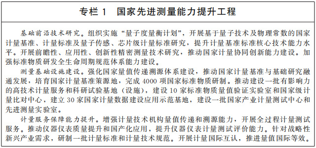 構(gòu)建現(xiàn)代先進(jìn)測量體系。加強(qiáng)以量子計量為核心的先進(jìn)測量體系建設(shè),加快建立新一代國家計量基準(zhǔn),推進(jìn)社會公用計量標(biāo)準(zhǔn)升級換代,制定一批關(guān)系國計民生的重要計量技術(shù)規(guī)范。改革完善計量器具型式批準(zhǔn)、檢定、法制監(jiān)督等管理制度,對強(qiáng)制管理的計量器具目錄實施動態(tài)調(diào)整,完善商品量、計量數(shù)據(jù)等量值監(jiān)管制度。深入推進(jìn)計量技術(shù)機(jī)構(gòu)改革創(chuàng)新發(fā)展,探索計量校準(zhǔn)市場和校準(zhǔn)機(jī)構(gòu)建設(shè)的有效途徑,規(guī)范計量校準(zhǔn)市場,滿足市場對量值溯源和測試服務(wù)的需求。建立國家計量數(shù)據(jù)建設(shè)應(yīng)用示范基地,提升國家產(chǎn)業(yè)計量測試和能源計量能力。積極參與國際計量比對,提升國際承認(rèn)的校準(zhǔn)與測量能力。