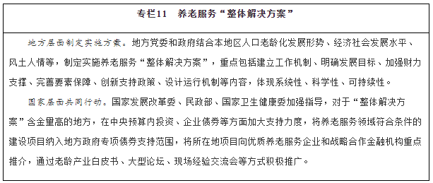 各?。ㄗ灾螀^(qū)、直轄市)要根據(jù)人口老齡化發(fā)展形勢(shì),制定實(shí)施專(zhuān)項(xiàng)規(guī)劃,加強(qiáng)與相關(guān)規(guī)劃銜接。各級(jí)老齡工作委員會(huì)要發(fā)揮統(tǒng)籌協(xié)調(diào)作用,推動(dòng)老齡工作委員會(huì)各成員單位履職盡責(zé),形成工作合力。發(fā)揮養(yǎng)老服務(wù)聯(lián)席會(huì)議制度作用,推進(jìn)養(yǎng)老服務(wù)體系建設(shè),強(qiáng)化區(qū)域養(yǎng)老服務(wù)資源統(tǒng)籌管理。支持城市群、都市圈打造養(yǎng)老服務(wù)體系一體化建設(shè)格局,形成服務(wù)能力銜接、產(chǎn)業(yè)發(fā)展協(xié)同的合作區(qū)域。支持大型城市和區(qū)域中心城市推動(dòng)養(yǎng)老產(chǎn)業(yè)集聚發(fā)展,充分發(fā)揮輻射帶動(dòng)和示范作用。推動(dòng)以地級(jí)行政區(qū)為單位制定“整體解決方案”,將老齡事業(yè)發(fā)展和養(yǎng)老服務(wù)體系建設(shè)納入經(jīng)濟(jì)社會(huì)發(fā)展全局中通盤(pán)考慮,全方位整合資源力量,充分調(diào)動(dòng)各方積極性,推動(dòng)兜底性、普惠型、多樣化三種路徑協(xié)同發(fā)展。