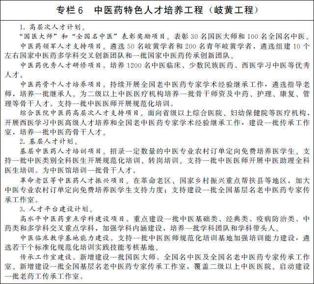 2.強(qiáng)化中醫(yī)藥特色人才隊(duì)伍建設(shè)。實(shí)施中醫(yī)藥特色人才培養(yǎng)工程(岐黃工程)。打造岐黃學(xué)者品牌,持續(xù)開(kāi)展岐黃學(xué)者培養(yǎng)、全國(guó)中醫(yī)臨床優(yōu)秀人才研修等項(xiàng)目,做強(qiáng)領(lǐng)軍人才、優(yōu)秀人才、骨干人才梯次銜接的高層次人才隊(duì)伍。建設(shè)一批高水平中醫(yī)藥重點(diǎn)學(xué)科。構(gòu)建符合中醫(yī)藥特點(diǎn)的人才培養(yǎng)模式,發(fā)展中醫(yī)藥師承教育,建立高年資中醫(yī)醫(yī)師帶徒制度,與職稱評(píng)審、評(píng)優(yōu)評(píng)先等掛鉤,持續(xù)推進(jìn)全國(guó)名老中醫(yī)藥專家傳承工作室、全國(guó)基層名老中醫(yī)藥專家傳承工作室建設(shè)。將綜合醫(yī)院、婦幼保健院等醫(yī)療機(jī)構(gòu)中醫(yī)藥人才納入各類中醫(yī)藥人才培養(yǎng)項(xiàng)目。按照“下得去、留得住、用得上”的要求,加強(qiáng)基層中醫(yī)藥人才隊(duì)伍建設(shè),根據(jù)需求合理確定中醫(yī)專業(yè)農(nóng)村訂單定向免費(fèi)培養(yǎng)醫(yī)學(xué)生規(guī)模,在全科醫(yī)生特崗計(jì)劃中積極招收中醫(yī)醫(yī)師。推廣中醫(yī)藥人員“縣管鄉(xiāng)用”,探索推進(jìn)輪崗制與職稱評(píng)審相銜接。適當(dāng)放寬長(zhǎng)期服務(wù)基層的中醫(yī)醫(yī)師職稱晉升條件,表彰獎(jiǎng)勵(lì)評(píng)優(yōu)向基層一線和艱苦地區(qū)傾斜,引導(dǎo)中醫(yī)藥人才向基層流動(dòng)。