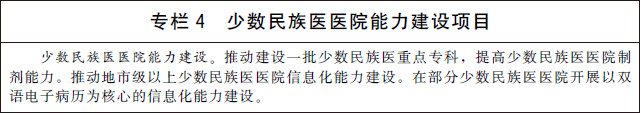 3.發(fā)展少數(shù)民族醫(yī)藥。加強(qiáng)少數(shù)民族醫(yī)醫(yī)療機(jī)構(gòu)建設(shè),提高民族地區(qū)基層醫(yī)療衛(wèi)生機(jī)構(gòu)少數(shù)民族醫(yī)藥服務(wù)能力。改善少數(shù)民族醫(yī)醫(yī)院基礎(chǔ)設(shè)施條件,加強(qiáng)少數(shù)民族醫(yī)醫(yī)院??颇芰Α⒅苿┠芰托畔⒒芰ㄔO(shè)。建立符合少數(shù)民族醫(yī)醫(yī)療機(jī)構(gòu)自身特點(diǎn)和發(fā)展規(guī)律的績(jī)效評(píng)價(jià)指標(biāo)體系。加大少數(shù)民族醫(yī)藥防治重大疾病和優(yōu)勢(shì)病種研究力度,有效傳承特色診療技術(shù)和方法。鼓勵(lì)和扶持少數(shù)民族醫(yī)藥院校教育、師承教育和繼續(xù)教育。加大對(duì)少數(shù)民族醫(yī)藥的傳承保護(hù)力度,持續(xù)開(kāi)展少數(shù)民族醫(yī)藥文獻(xiàn)搶救整理工作,推動(dòng)理論創(chuàng)新和技術(shù)創(chuàng)新。