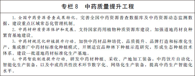 3.提升中藥產(chǎn)業(yè)發(fā)展水平。健全中藥材種植養(yǎng)殖、倉(cāng)儲(chǔ)、物流、初加工規(guī)范標(biāo)準(zhǔn)體系。鼓勵(lì)中藥材產(chǎn)業(yè)化、商品化和適度規(guī)?;l(fā)展,推進(jìn)中藥材規(guī)范化種植、養(yǎng)殖。鼓勵(lì)創(chuàng)建以中藥材為主的優(yōu)勢(shì)特色產(chǎn)業(yè)集群和以中藥材為主導(dǎo)的農(nóng)業(yè)產(chǎn)業(yè)強(qiáng)鎮(zhèn)。制定實(shí)施全國(guó)中藥飲片炮制規(guī)范,繼續(xù)推進(jìn)中藥炮制技術(shù)傳承基地建設(shè),探索將具有獨(dú)特炮制方法的中藥飲片納入中藥品種保護(hù)范圍。加強(qiáng)中藥材第三方質(zhì)量檢測(cè)平臺(tái)建設(shè)。研究推進(jìn)中藥材、中藥飲片信息化追溯體系建設(shè),強(qiáng)化多部門(mén)協(xié)同監(jiān)管。加快中藥制造業(yè)數(shù)字化、網(wǎng)絡(luò)化、智能化建設(shè),加強(qiáng)技術(shù)集成和工藝創(chuàng)新,提升中藥裝備制造水平,加速中藥生產(chǎn)工藝、流程的標(biāo)準(zhǔn)化和現(xiàn)代化。